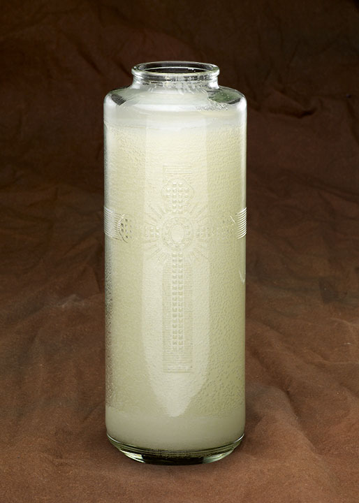 This Olivaxine blended candle is in a glass container and burns continuously for 8 days.